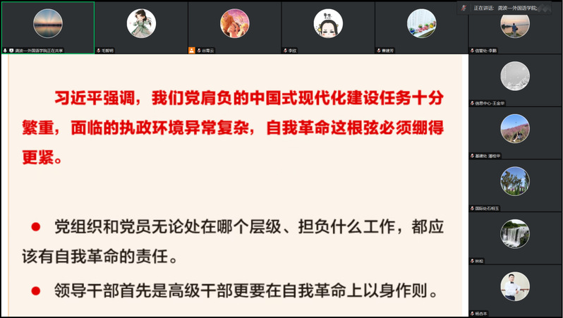在集中学习中,支部书记龚波同志围绕习近平总书记在中共中央政治局第二十一次集体学习的讲话和相关精神讲授廉政微党课,强调我们要悟透“中央八项规定是党中央徙木立信之举”精神本质,绷紧自我革命这根弦,廉洁自律,树立正的党风政风。随后,毕光辉、余松林、石相玉3位同志依次领学了王忠林主持召开省委党的建设工作领导小组会议暨深入贯彻中央八项规定精神学习教育推进会、在全省集中整治违规吃喝动员部署会上的讲话精神以及为全省领导干部讲授学习教育专题党课主要内容。在纪法宣传环节,杨杏本同志领学了《党组讨论和决定党员处分事项工作程序规定》的主要条款,李欣同志带领大家一起学习了党纪专题党课。最后,夏炜同志结合本次学习进行了交流发言,表示将学习精神内化于心、外化于行,提升自我廉洁意识、严守底线、抵制违规吃喝,营造纯净健康的校园氛围。