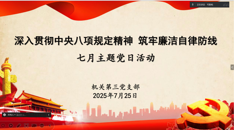 为深入学习贯彻习近平新时代中国特色社会主义思想,进一步强化支点意识、抬升发展标杆、决战决胜申博攻坚,7月25日下午,机关第三支部开展“深入贯彻中央八项规定精神,筑牢链接自律防线”线上主题党日活动。活动由支部书记龚波主持,支部全体党员参与了活动。